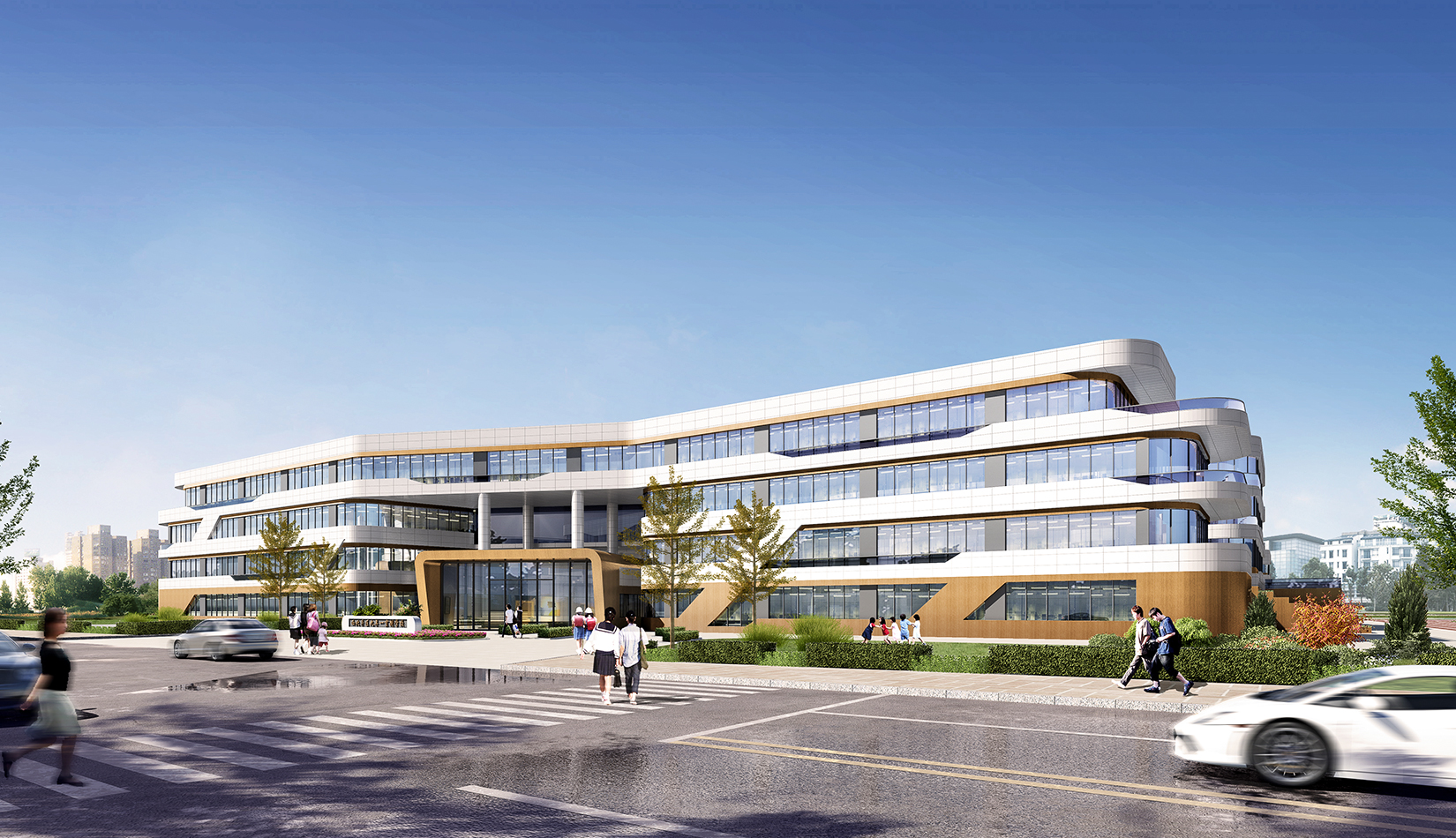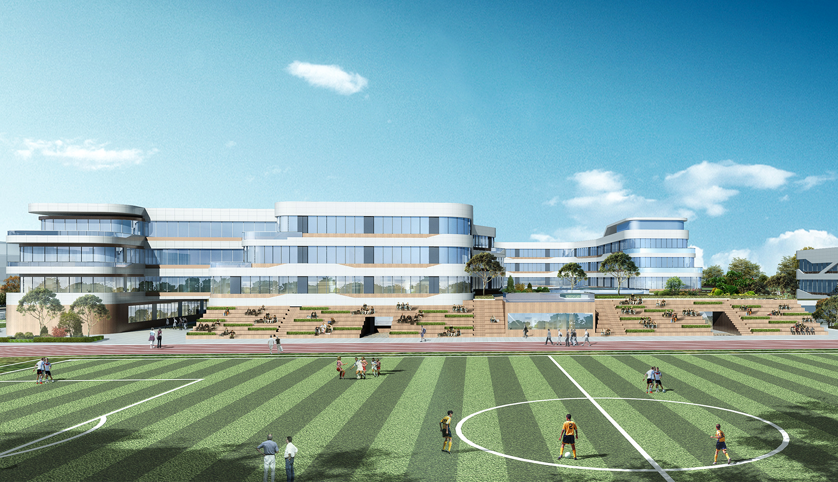 充滿綠化的連續(xù)平臺接通各教學(xué)樓,在東西南北方向形成內(nèi)院,由西向東側(cè)延伸,與操場融為一體,提供了良好的視覺穿透性。建筑風(fēng)格現(xiàn)代富有動感,線條流暢,形成強(qiáng)烈的可識別性。