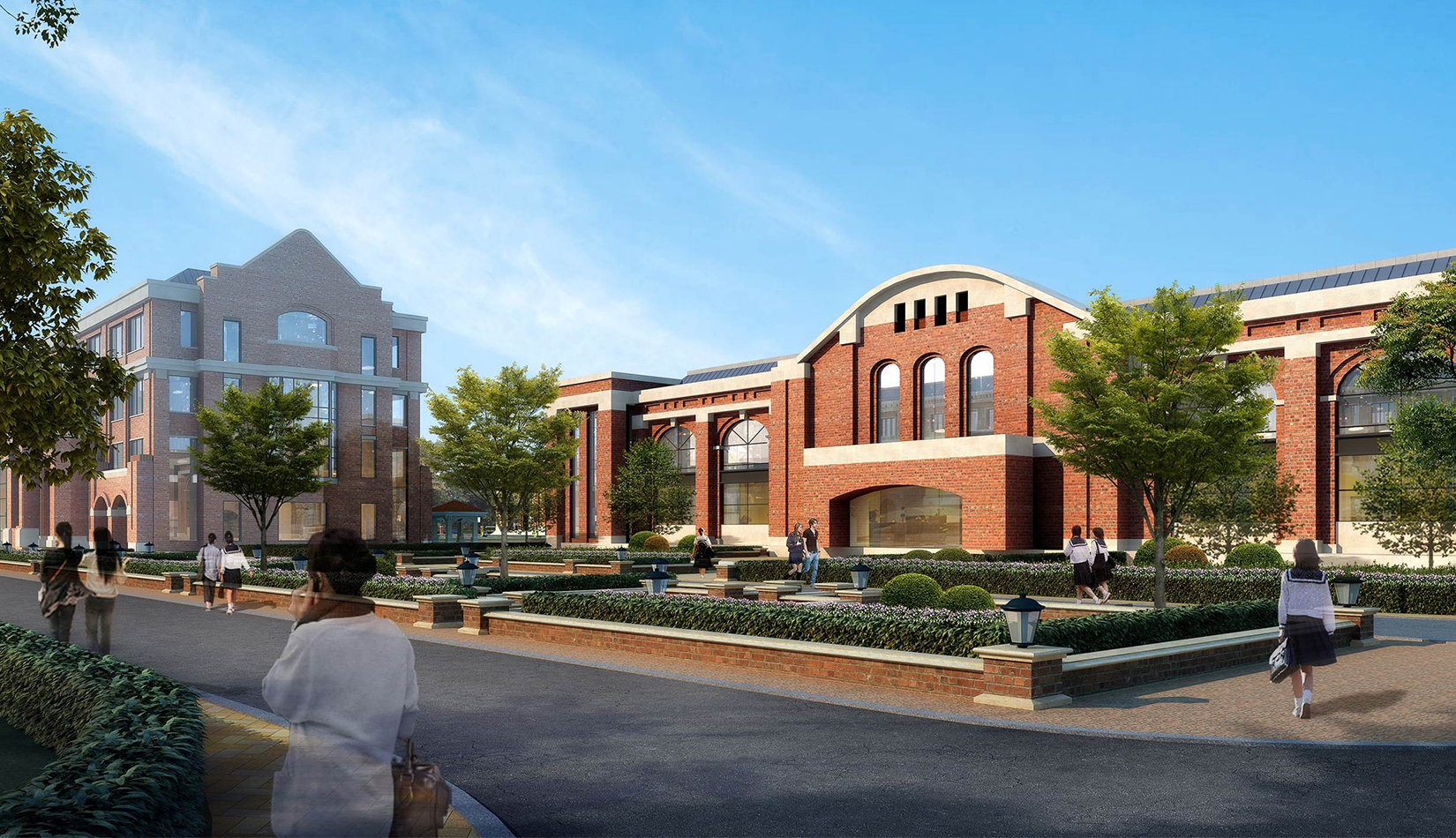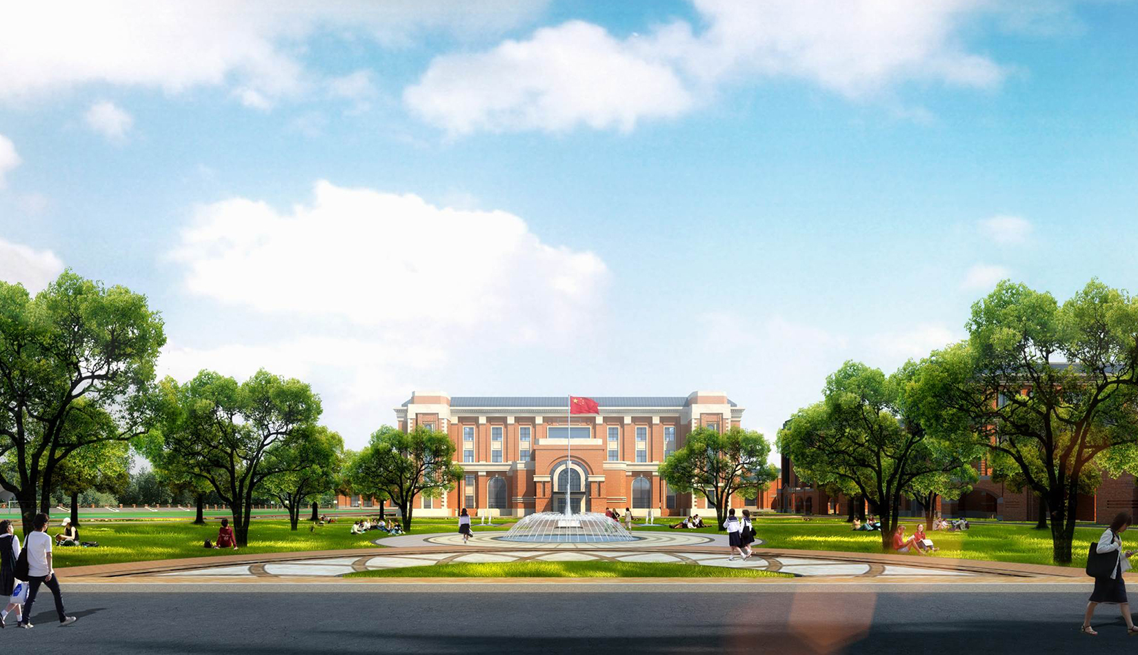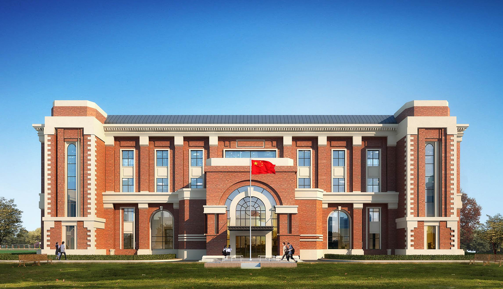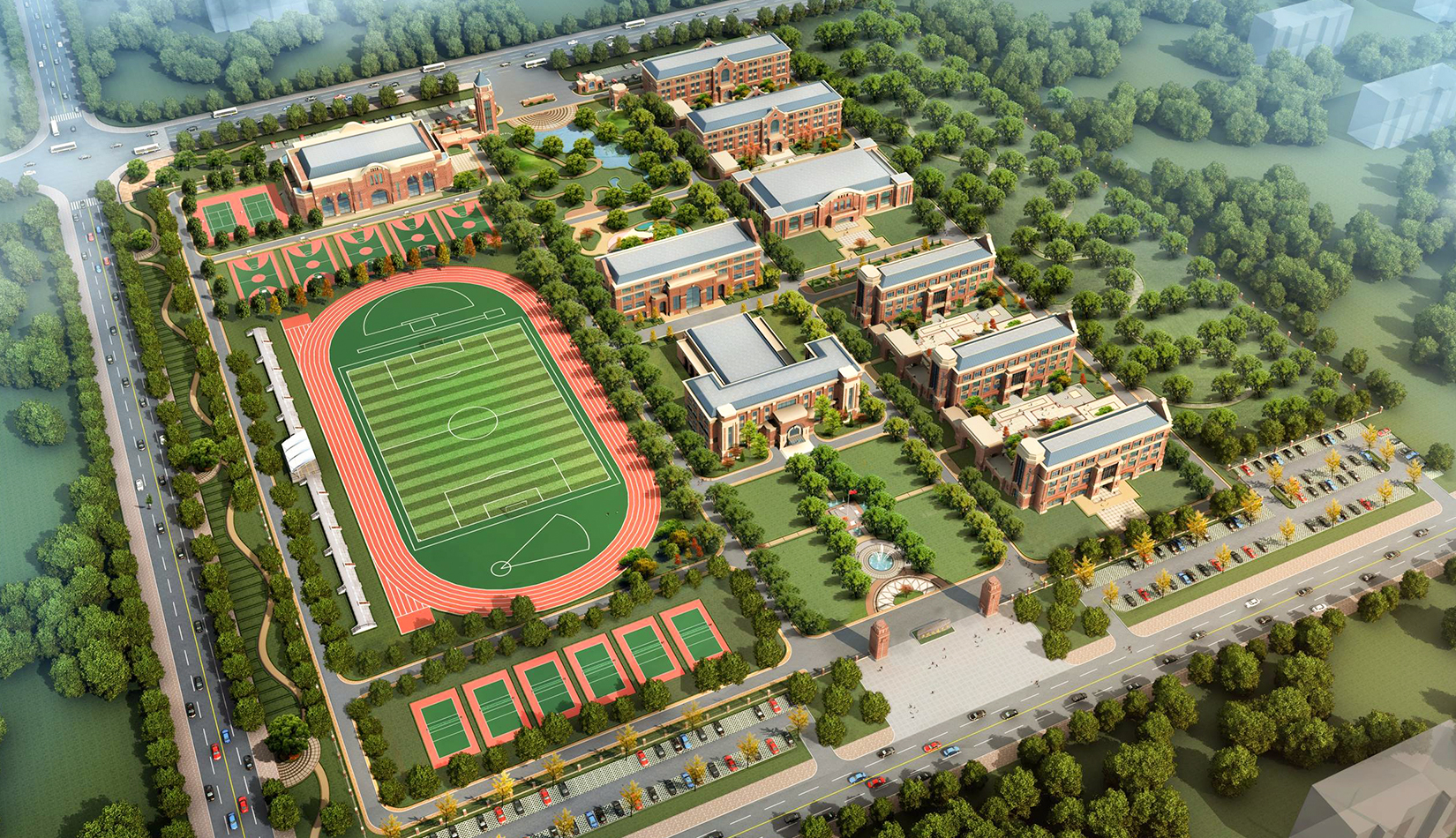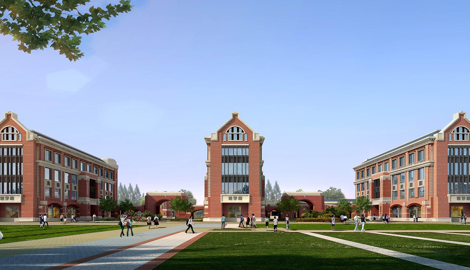 分區(qū)設(shè)計上,采用了“前場后園”的設(shè)計手法。前區(qū)以教學(xué)區(qū)為主,圍繞中心圖書綜合樓形成前區(qū)禮儀性廣場,同時以中軸對稱為原則,體現(xiàn)了教學(xué)的嚴肅性與秩序性;各個教學(xué)單元以年級、功能就近布置為基本原則,以中國傳統(tǒng)的“院落”形式進行組合,后院生活區(qū)借鑒了“山水園林”的布局手法,結(jié)合中心景觀,進行自由化布局,達到景入園中、人在景中生活場景,使學(xué)生在學(xué)習(xí)之余,得到充分的放松。