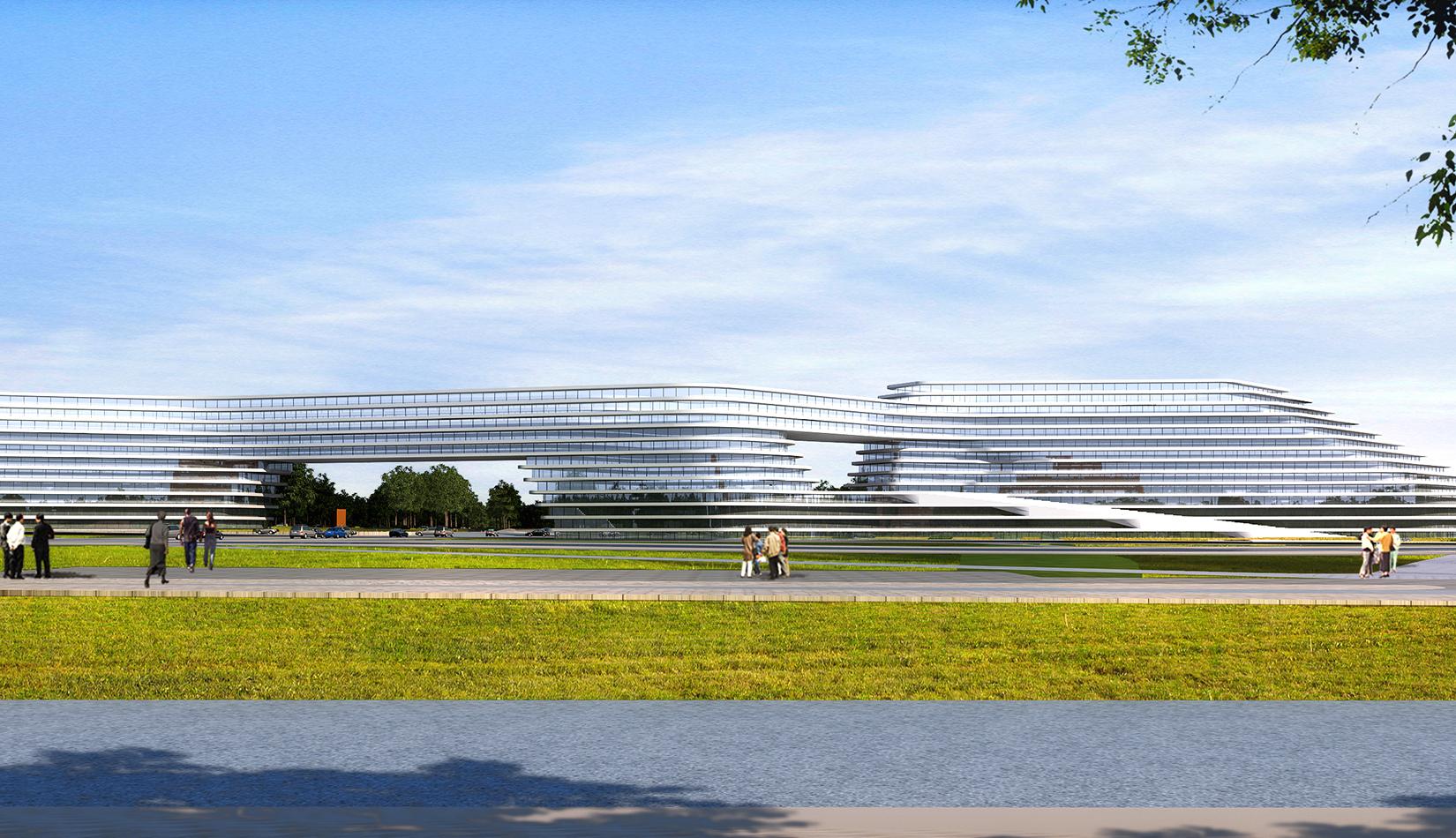 科學(xué)講堂位于中心區(qū)景觀主軸的中心腹地,其南的泄洪渠為景觀主軸的景觀帶。設(shè)計靈感源于中國天人合一的自然觀和社會觀,所謂仁者樂山智者樂水,通過對山、水肌理的分析與重構(gòu),轉(zhuǎn)換為建筑語言,形成獨(dú)具特色的建筑造型。建筑體量形成簡單、沖突的場地氛圍,建筑南向正對園區(qū)中軸線,使得水平向延展的建筑生成了“東高西低”的無邊際界面。由“水面→河岸→場地→建筑”的溪水肌理驅(qū)動建筑臨街面,逐步退后產(chǎn)生特有的河流沖刷意象。水流的蜿蜒曲折使建筑的轉(zhuǎn)彎處成洞,達(dá)到了內(nèi)外視線連續(xù)的綜合效果,并將對建筑的擠壓力平衡到建筑東西兩翼。建筑表皮通過對水的情緒變化等模擬,形成片狀的建筑造型。