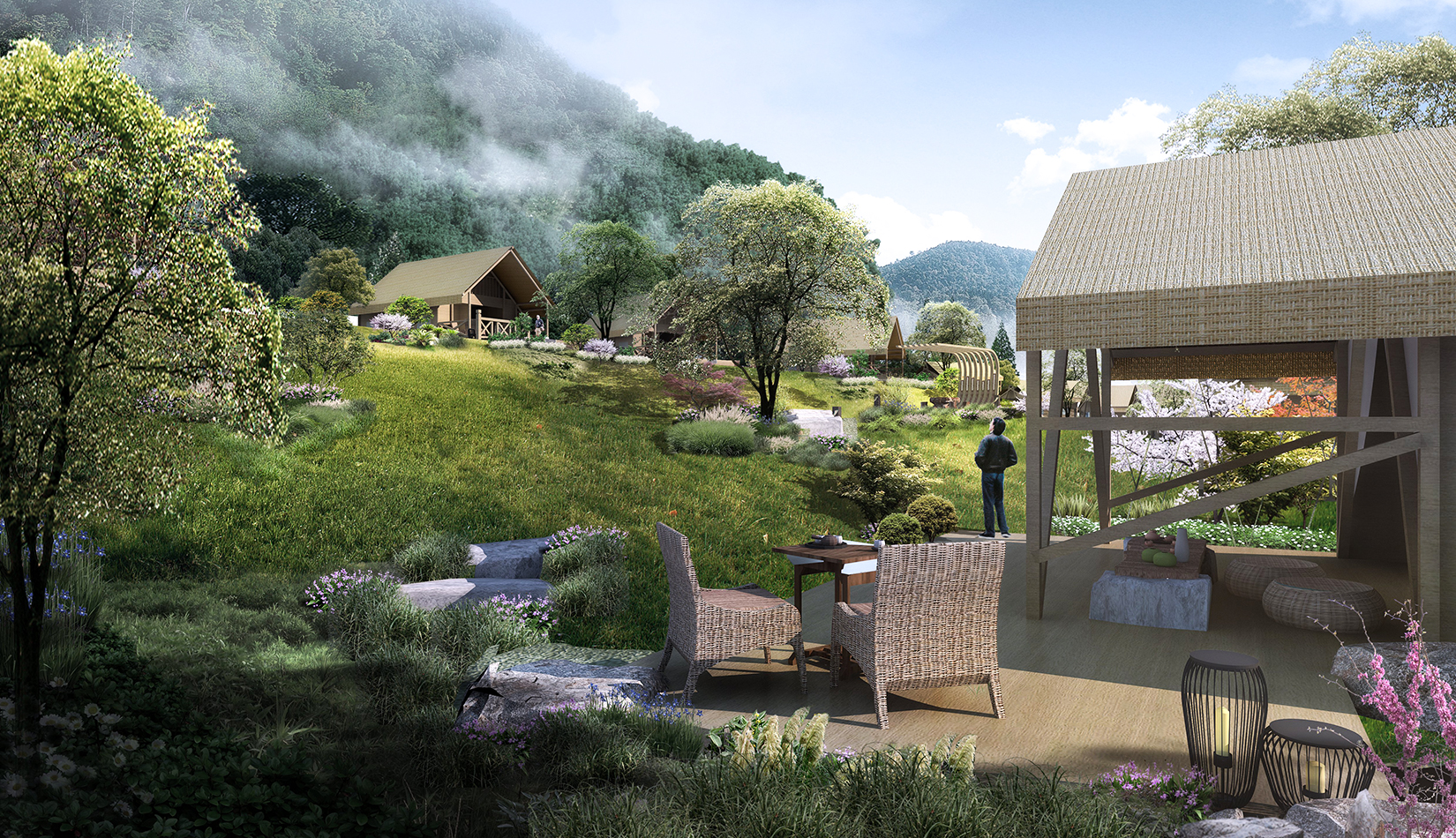 景觀設(shè)計(jì)從野奢度假酒店的“野”和“奢”兩字入手,融入荒野生態(tài)的設(shè)計(jì)理念,又要與場(chǎng)地相融合、與原生態(tài)相映、與當(dāng)?shù)氐拿袼罪L(fēng)情相交匯,突出當(dāng)?shù)氐奈幕黝},強(qiáng)調(diào)高品質(zhì)的自然、野奢度假,從而打造出一個(gè)具備個(gè)性與特色,使游客能夠享受到自然野趣體驗(yàn)的景觀環(huán)境。