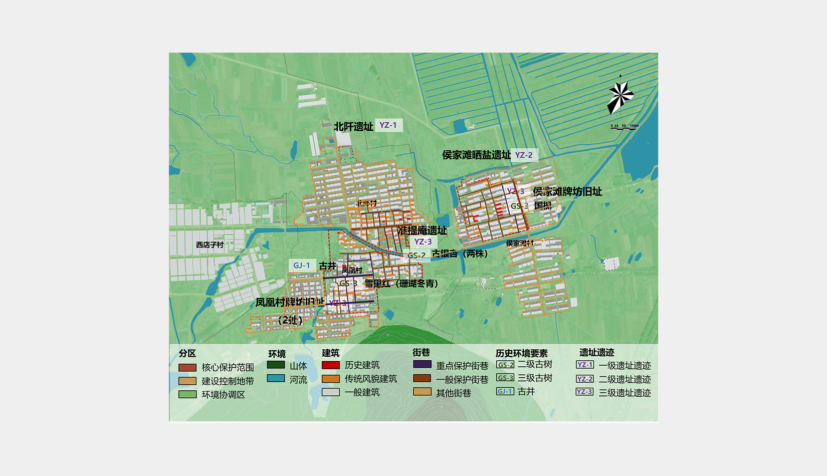 金口村保護(hù)規(guī)劃總圖分為五級(jí):分區(qū)保護(hù)、建筑保護(hù)、街巷保護(hù)、歷史環(huán)境要素保護(hù)、遺址遺跡保護(hù)。