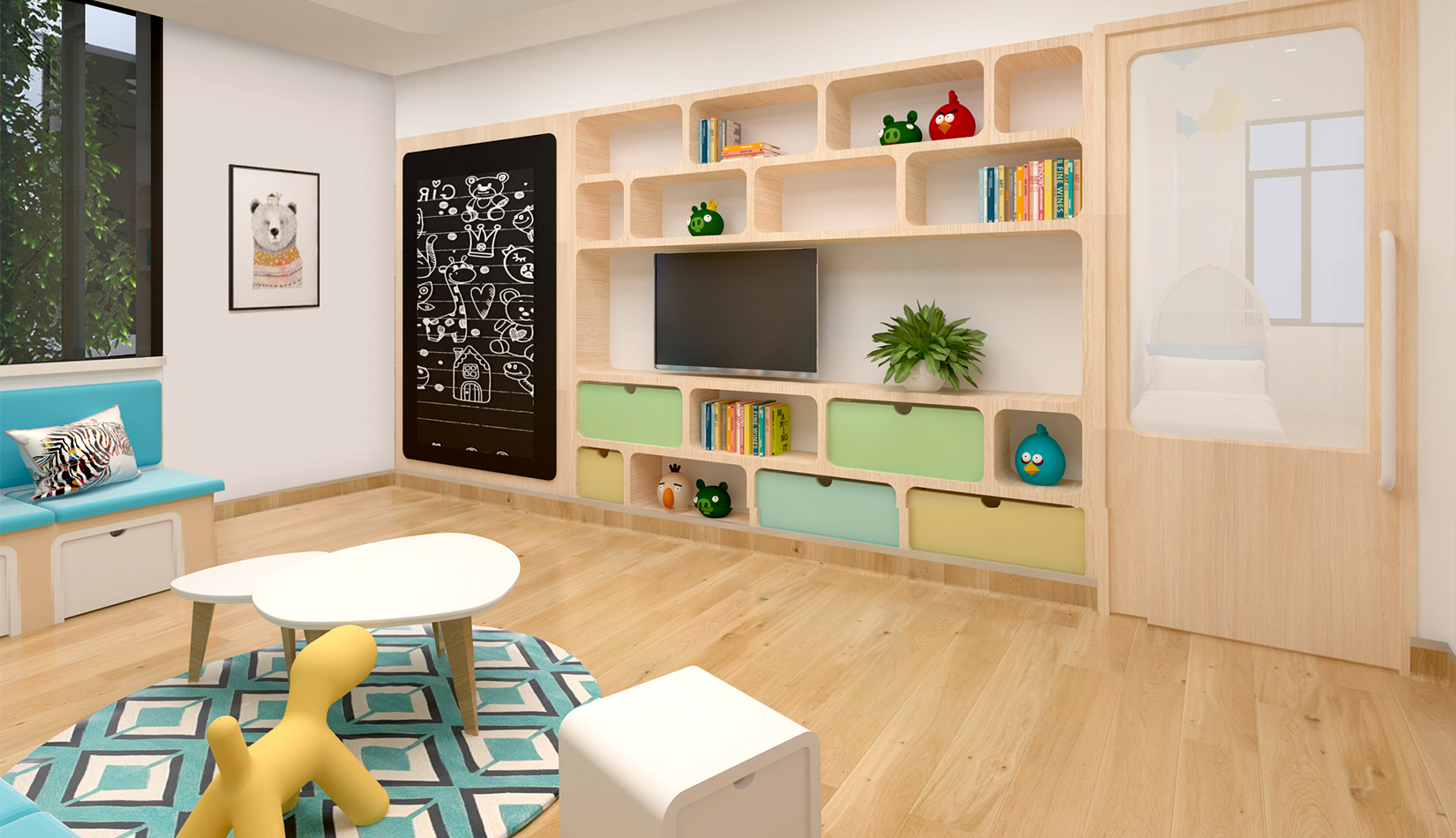 室內(nèi)延續(xù)建筑,空間內(nèi)部采光非常好。設(shè)計簡潔、現(xiàn)代,以白色為主色調(diào),搭配淺木色作為室內(nèi)顏色?;顫姟⒑脛?、天真、可愛是兒童最大的特點,在其具體功能空間設(shè)計中,我們把這些特點和空間色彩結(jié)合起來,不同的空間根據(jù)其使用功能,采用了不同的色彩搭配。