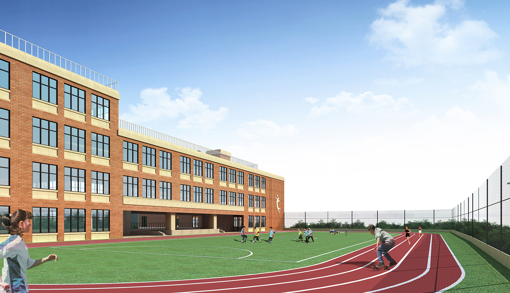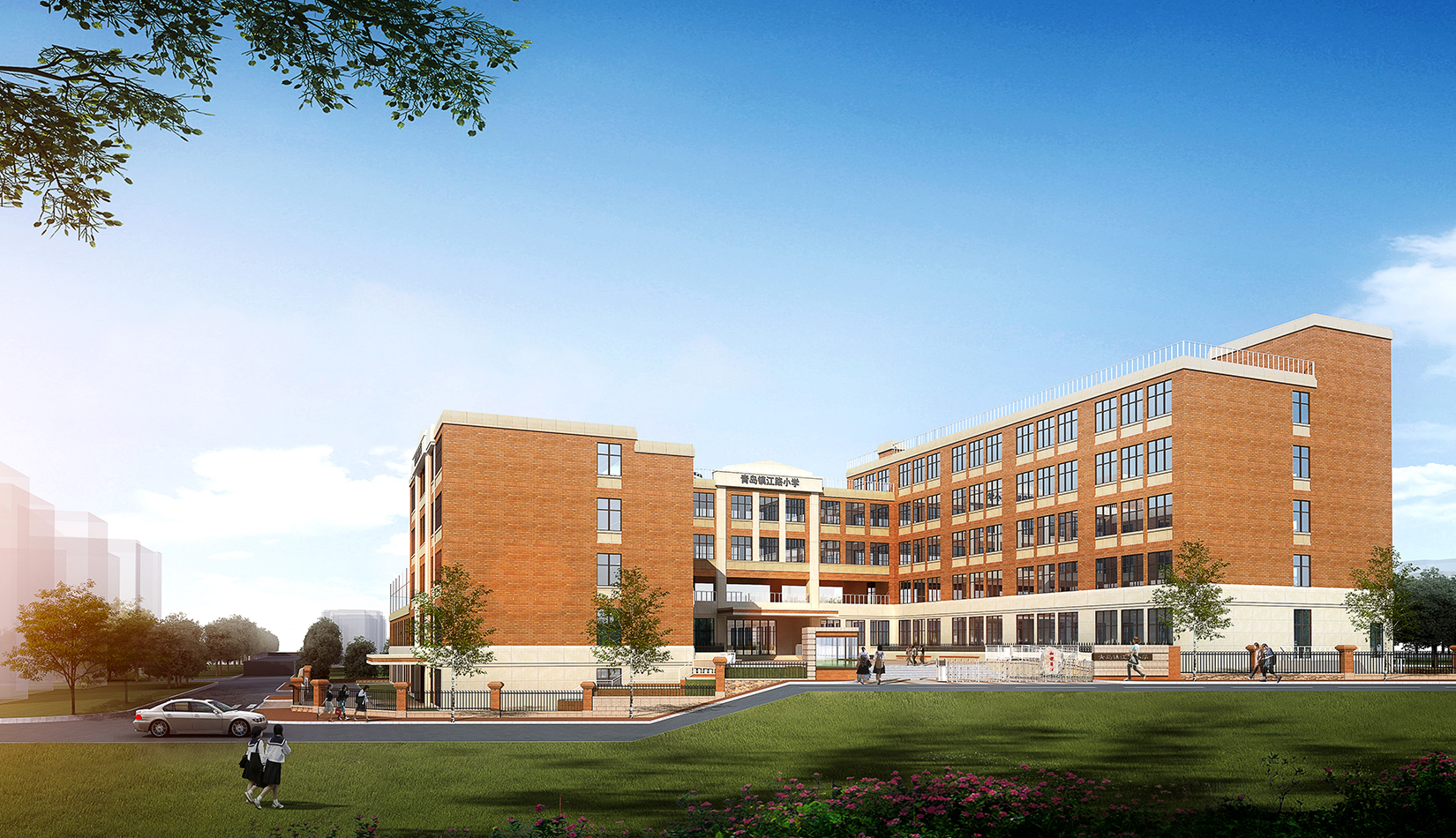 該項目的設計延續(xù)區(qū)域肌理,與區(qū)域城市肌理相融合,提高區(qū)域環(huán)境。立面設計考慮市南區(qū)及鎮(zhèn)江路原有學校風格,采用學院派建筑風格,塑造古典人文氛圍,校園墻體通過磚的變化設計文化墻,將文化傳承與精神傳承融合在建筑之中。根據地勢和日照進行功能布局排列,下沉庭院、連廊和架空設計的鄰近操場的校園環(huán)境設計,一方面塑造了豐富多彩的校園環(huán)境,另一方面充分保證了室內環(huán)境的采光,讓孩子們更多地享受陽光。