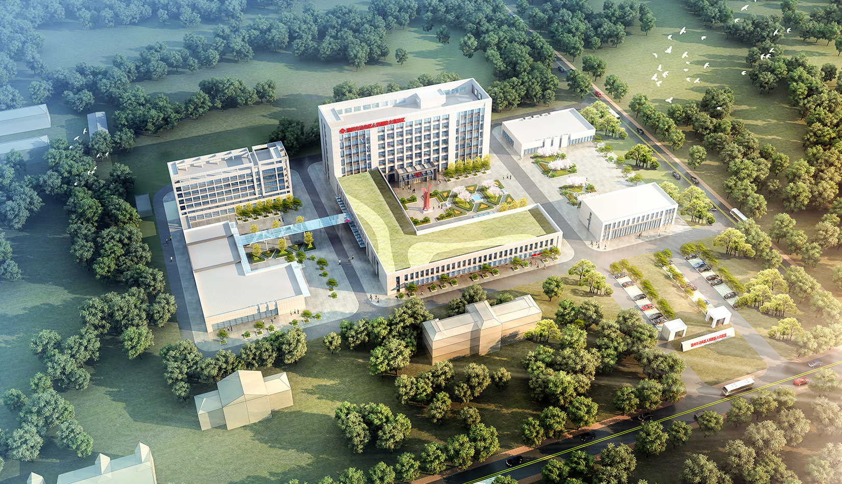 景觀設(shè)計采用圍合、穿插、滲透等設(shè)計手法,營造公園式景觀綠化,與建筑群體融合呼應(yīng),打造一個會呼吸多元化的綠色醫(yī)院,利用建筑之間的圍合關(guān)系,創(chuàng)造動態(tài)的具有生命力的局部景觀。