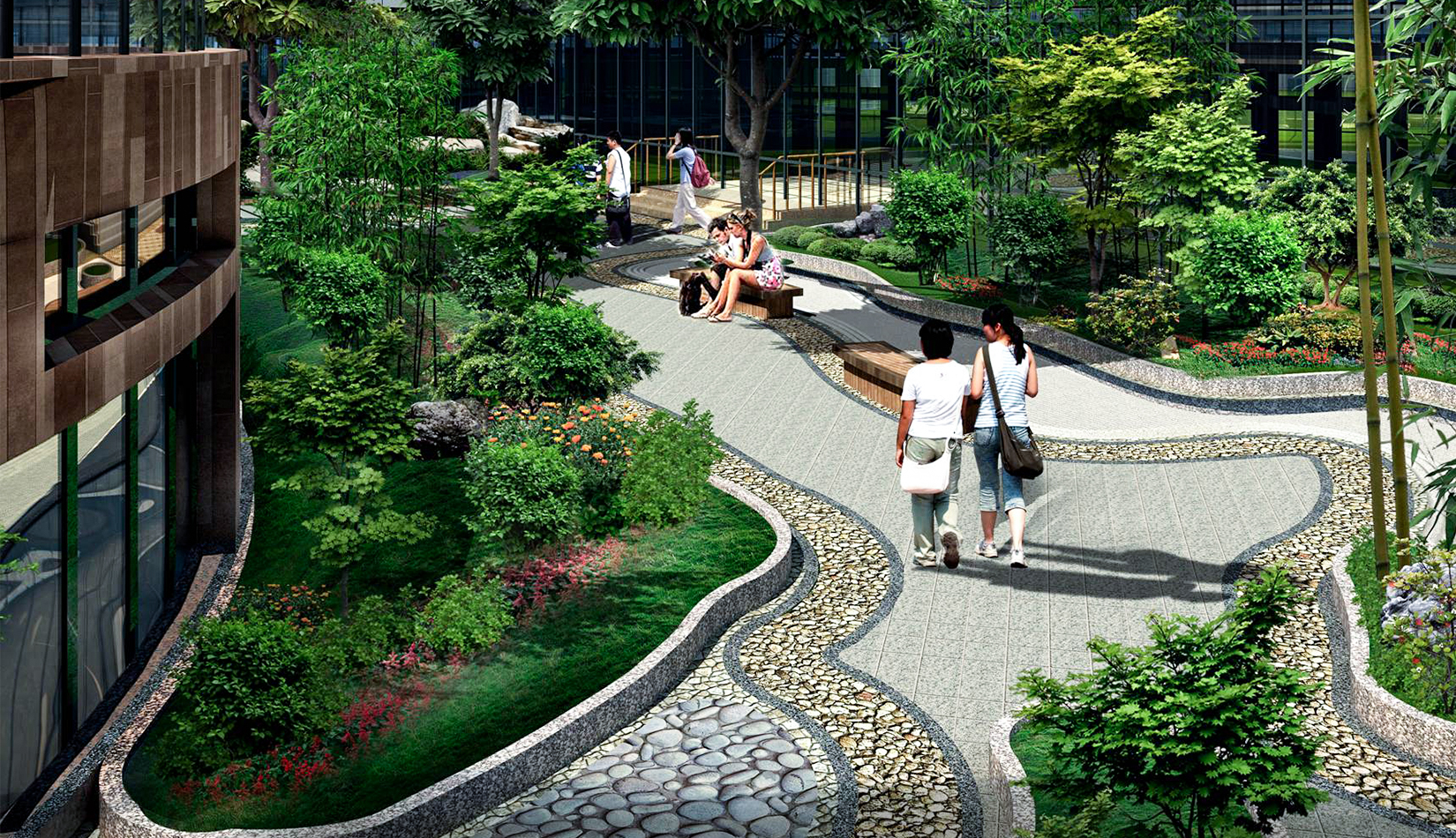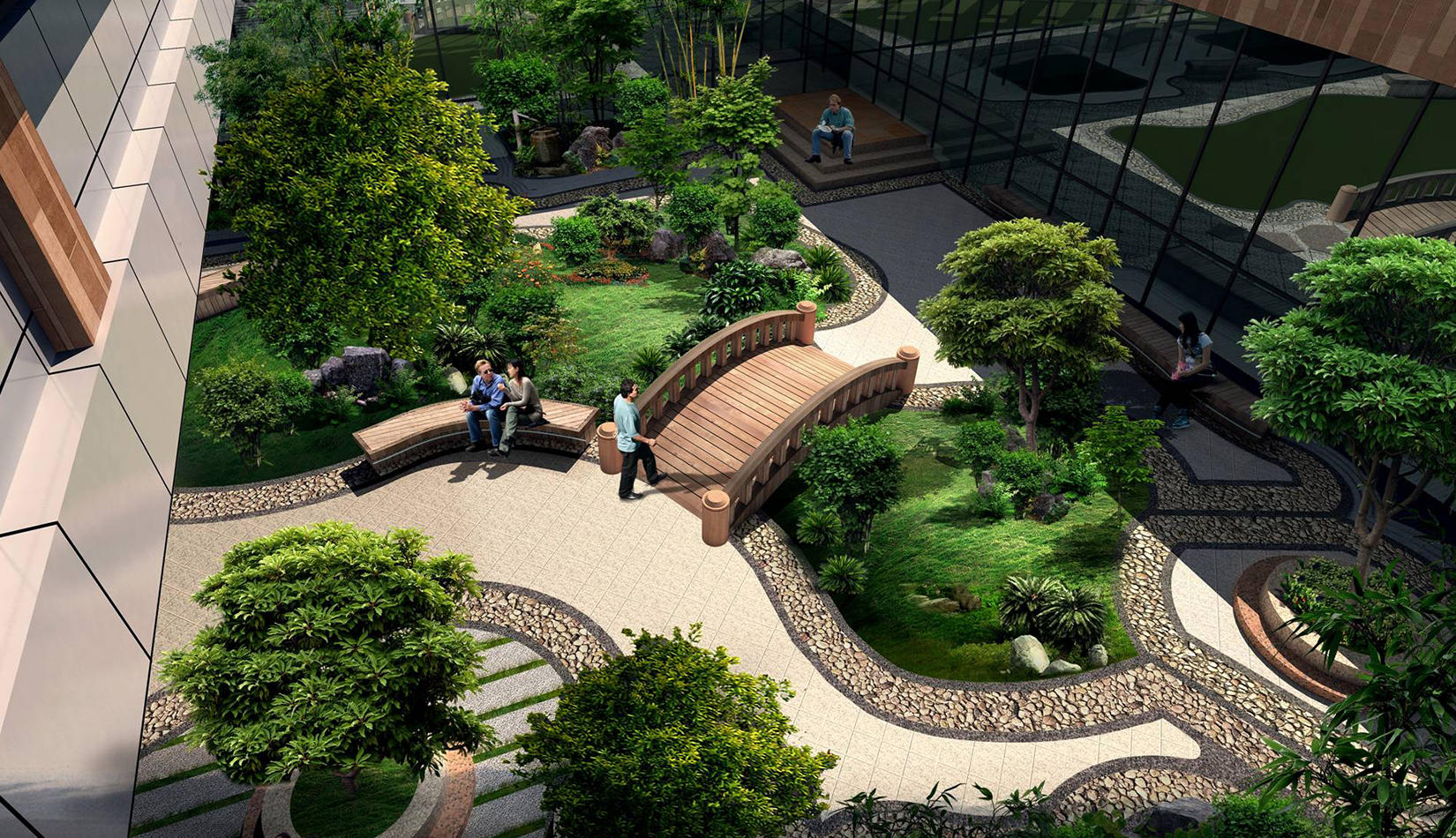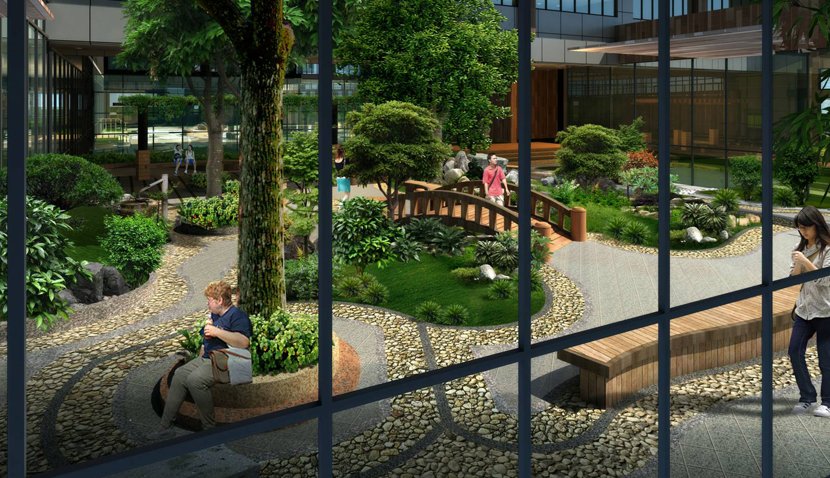 2. 綜合服務樓中心設(shè)計特色水景一處,潺潺的流水聲,增加整個入口空間的活潑歡快的氣氛。