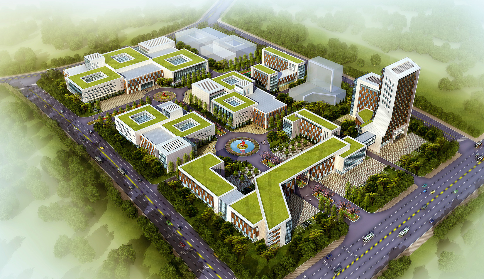 設(shè)計中著重實(shí)現(xiàn)“產(chǎn)業(yè)有核體”理念。依據(jù)功能不同,各自以庭院、廣場的形式形成獨(dú)立核心。以類似“綜合體”的形式實(shí)現(xiàn)各自功能分區(qū)的獨(dú)立完整。兩大功能核心體主軸線體系為基礎(chǔ)進(jìn)行串聯(lián),在保證相互間直達(dá)性的同時又互不干擾。