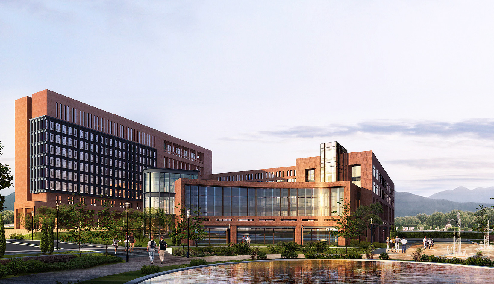 總體的規(guī)劃布局圍繞中心景觀廣場(chǎng)展開設(shè)計(jì)。首先從山區(qū)建筑布局師法自然,藏風(fēng)聚氣的傳統(tǒng)觀念出發(fā),結(jié)合現(xiàn)代科學(xué)嚴(yán)謹(jǐn)求真務(wù)實(shí)的態(tài)度,設(shè)計(jì)以東側(cè)入口廣場(chǎng)導(dǎo)入的中心景觀空間圍合展開規(guī)劃布局,總體上根據(jù)土地的使用性質(zhì)分為四個(gè)區(qū),分別是正對(duì)主入口北側(cè)的生活區(qū),南側(cè)的孵化中心區(qū),正對(duì)主入口廣場(chǎng)的科研辦公區(qū),以及整個(gè)用地最南端的產(chǎn)業(yè)開發(fā)區(qū),各個(gè)區(qū)既相互獨(dú)立同時(shí)又緊密聯(lián)系,功能上即考慮主導(dǎo)風(fēng)向又方便使用。