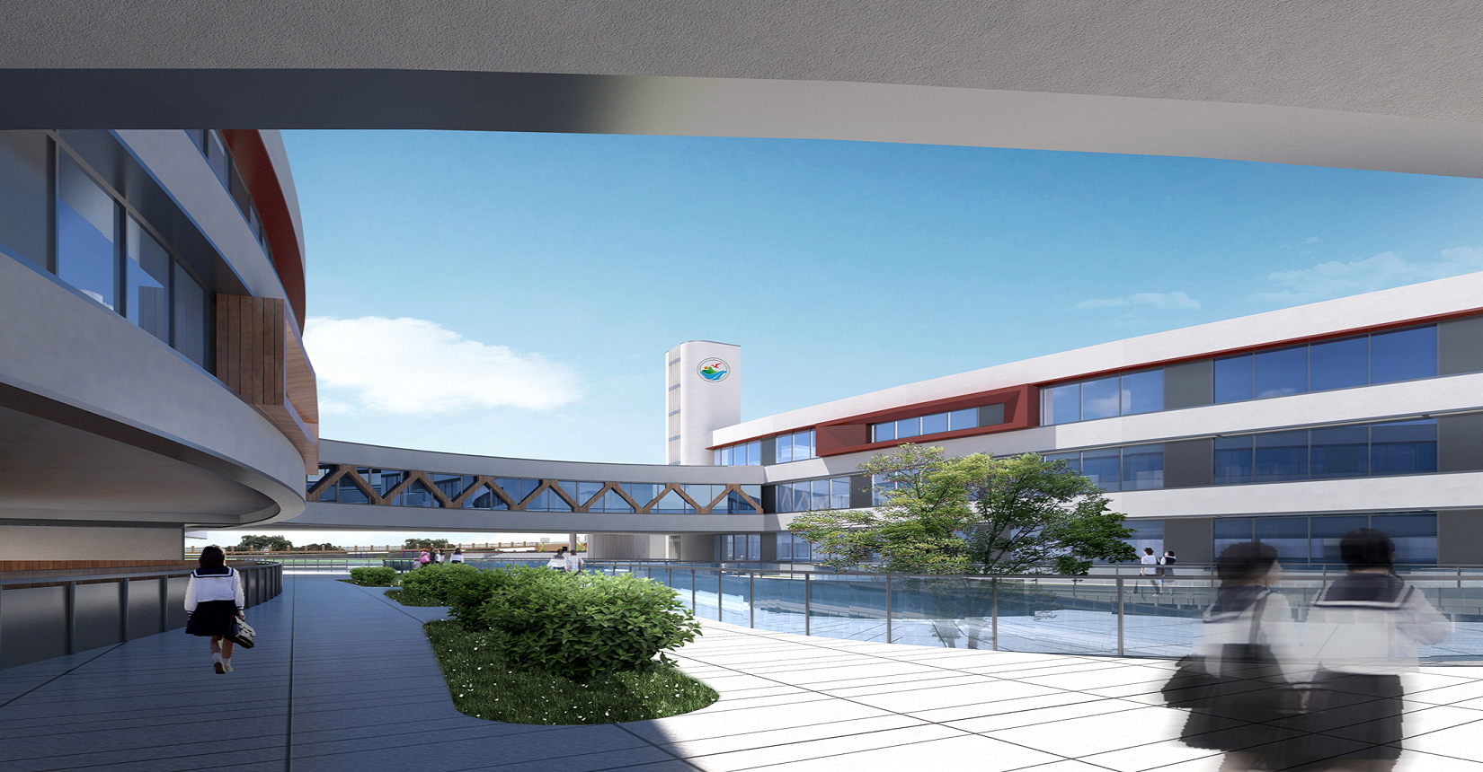 校園規(guī)劃采用曲線手法,營(yíng)造流水姿態(tài),將東側(cè)山脈與西側(cè)河流連接在一起。設(shè)計(jì)現(xiàn)代化“山水”校園,使學(xué)生在自然中成長(zhǎng)。營(yíng)造活水發(fā)源的“源頭”意境,寓意教育為人類文化長(zhǎng)河的源頭,呼應(yīng)學(xué)?!霸搭^”文化。曲線舒展的形體,整體采用白色色調(diào),局部以紅黃色進(jìn)行點(diǎn)綴,風(fēng)格純潔又不失活潑。